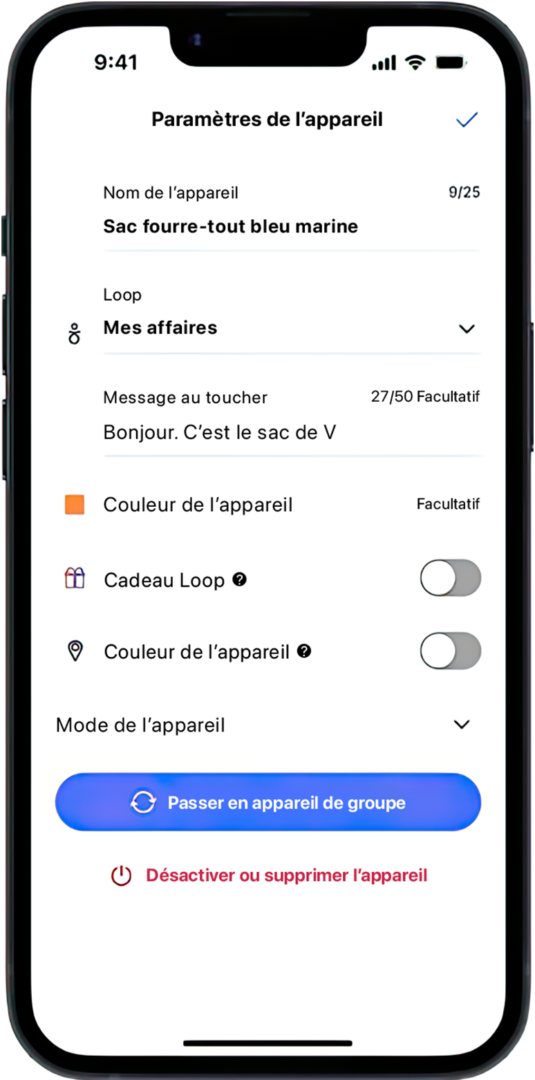 Les paramètres au niveau de l’appareil ne s’appliquent qu’à cet appareil et certains d’entre eux seront visibles sur 🪄Écran d’activation. En général, vous pouvez attribuer un nom, un Loop, une couleur et un emplacement à votre appareil afin de le différencier des autres appareils. Par ailleurs, le message ou le contenu de tap s’affiche sur l’écran d’activation lorsque d’autres personnes scannent votre appareil.